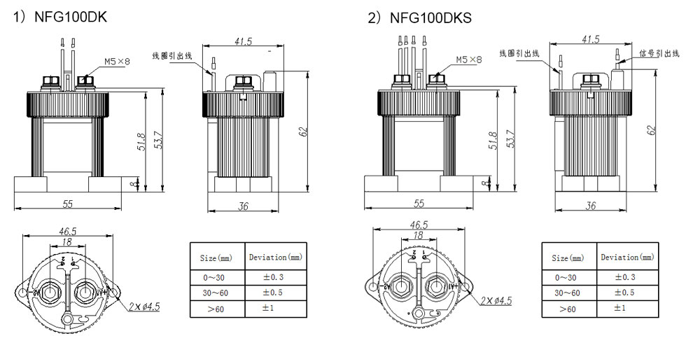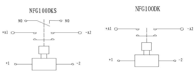 Example: NFG100DK/24V indicates that the rated current of the product load is 100A (resistive), the main contact form is one normal open (internal thread), the coil voltage is DC 24V, and the bottom installation method is used.