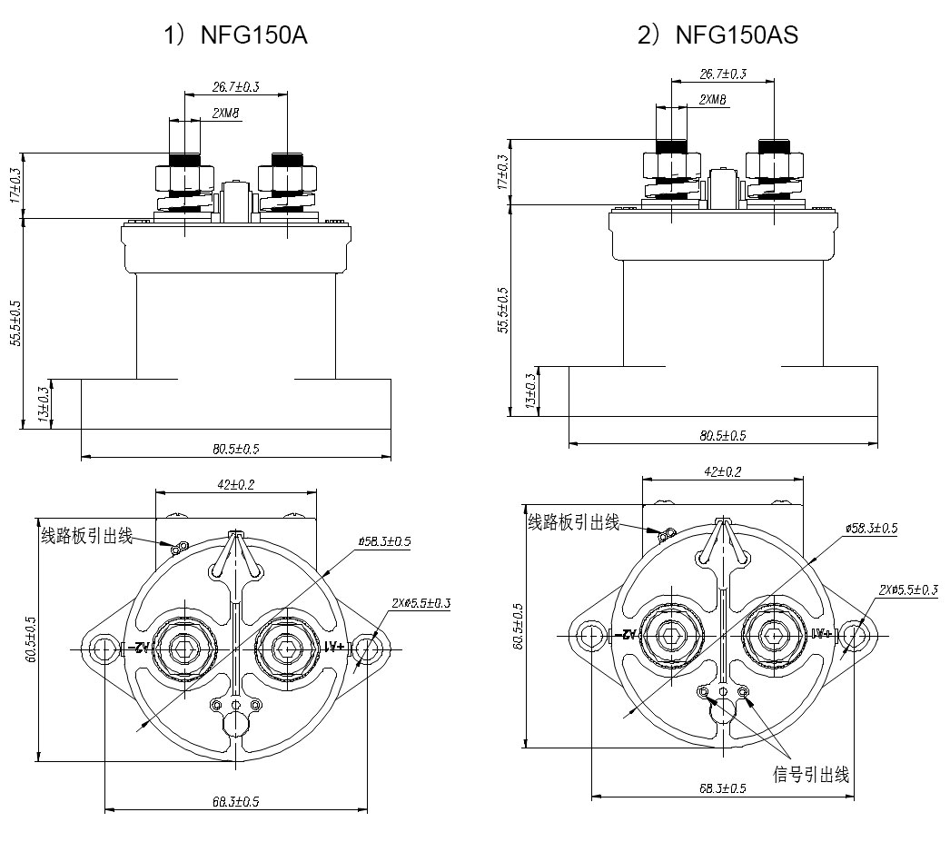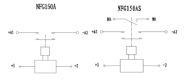 Example: NFG150AS indicates that the rated current of the product load is 150A (resistive), the main contact form is one normal open (external thread) with one normal open auxiliary contacts, the coil voltage is (9~36)V (DC), and the bottom installation method is used.