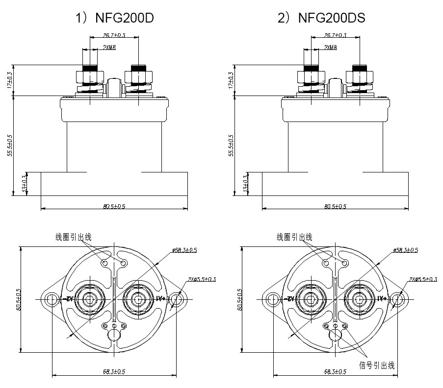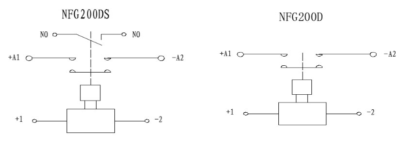 Example: NFG200DS indicates that the rated current of the product load is 200A (resistive), the main contact form is one normal open (external thread) with one normal open auxiliary contacts, the coil voltage is DC 12V, and the bottom installation method is used.