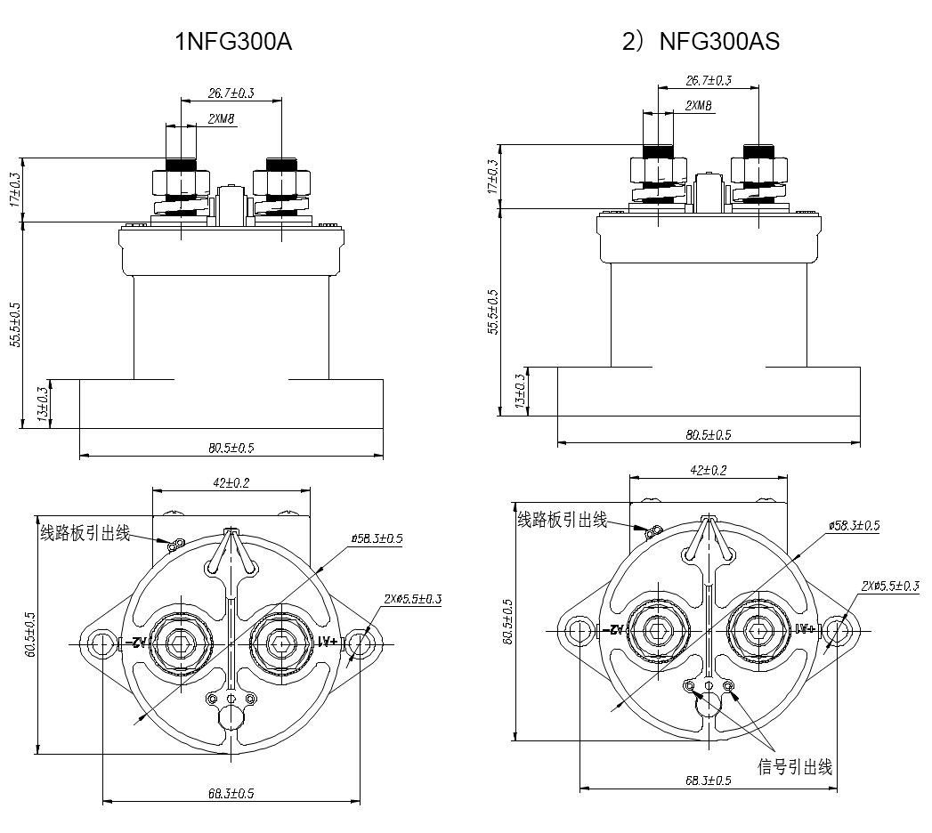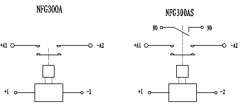 Example: NFG300AS indicates that the rated current of the product load is 300A (resistive), the main contact form is one normal open (external thread) with one normal open auxiliary contacts, the coil voltage is (9-36) V (DC), and the bottom installation method.