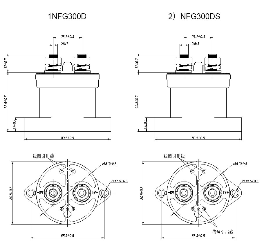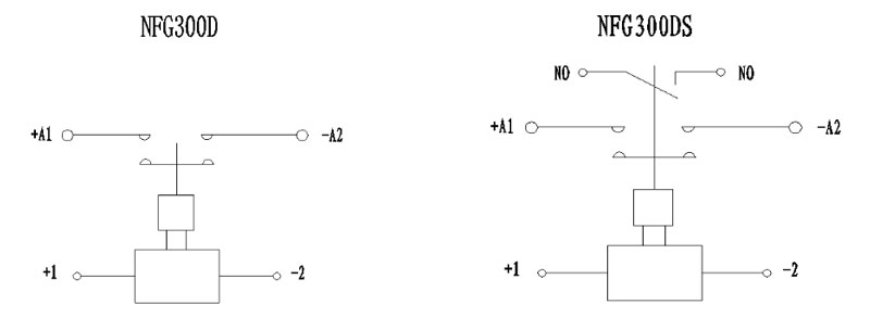 Example: NFG300DS indicates that the rated current of the product load is 300A (resistive), the main contact form is one normal open (external thread) with one normal open auxiliary contacts, the coil voltage is DC 12V, and the bottom installation method.