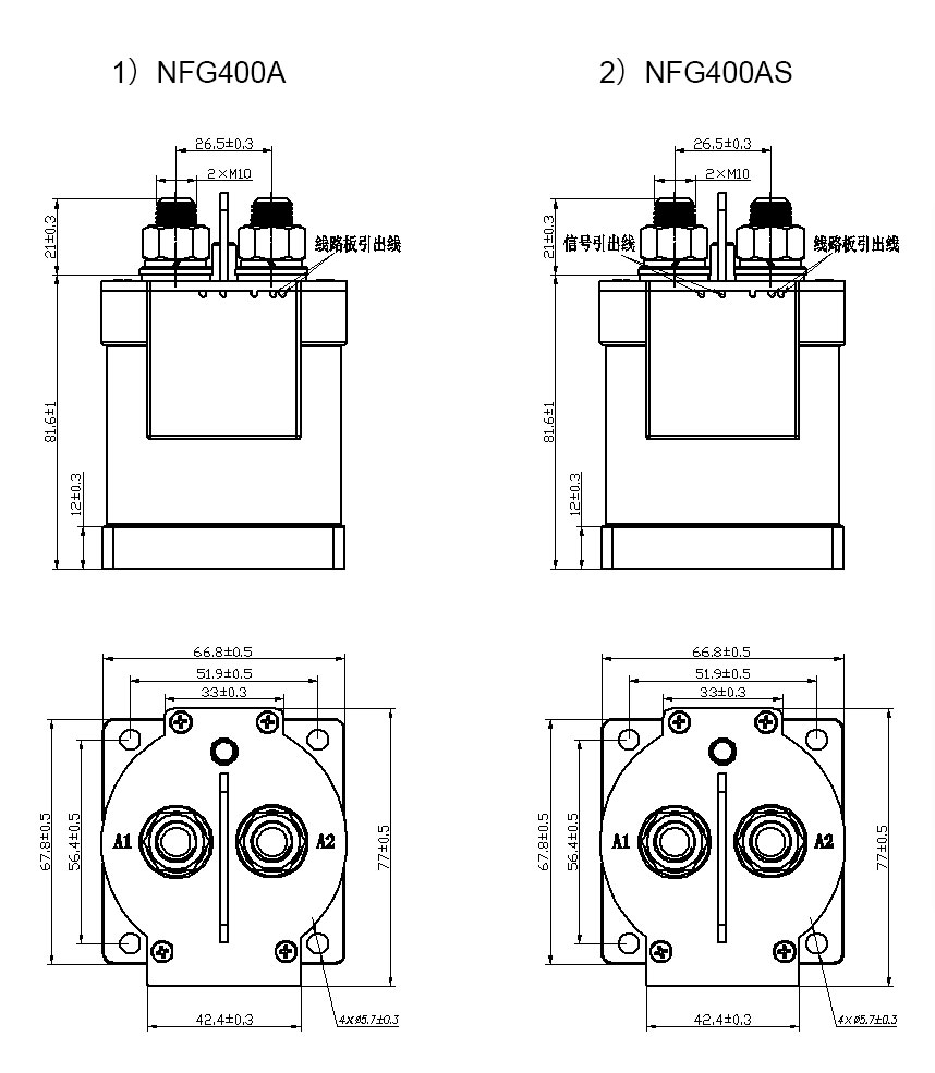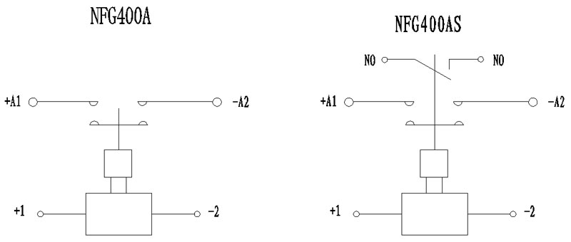 Example: NFG400AS indicates that the rated current of the product load is 400A (resistive), the main contact form is one normal open (external thread) with one normal open auxiliary contacts, the coil voltage is (9-36) V (DC), and the bottom installation method.