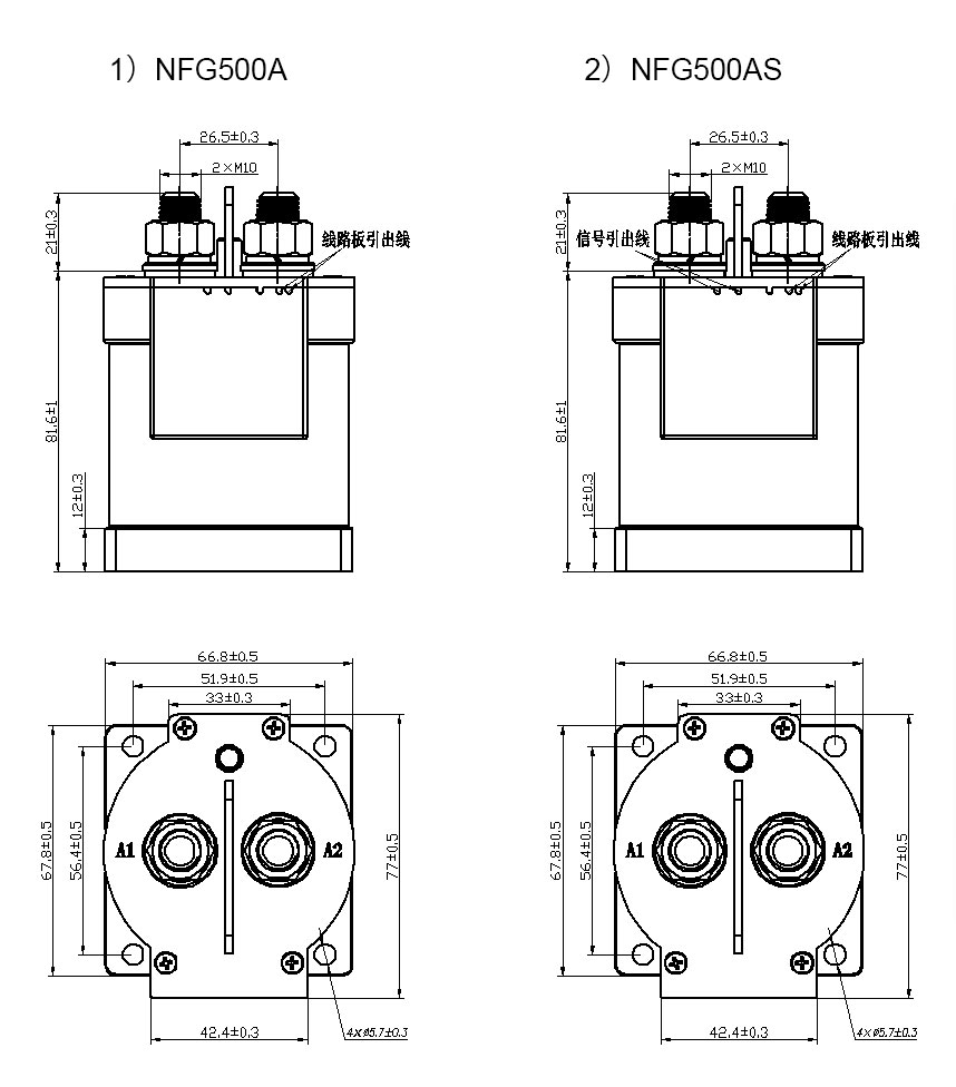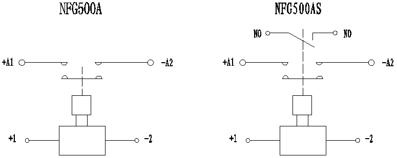 Example: NFG500AS indicates that the rated current of the product load is 500A (resistive), the main contact form is one normal open (external thread) with one normal open auxiliary contacts, the coil voltage is (9-36) V (DC), and the bottom installation method.